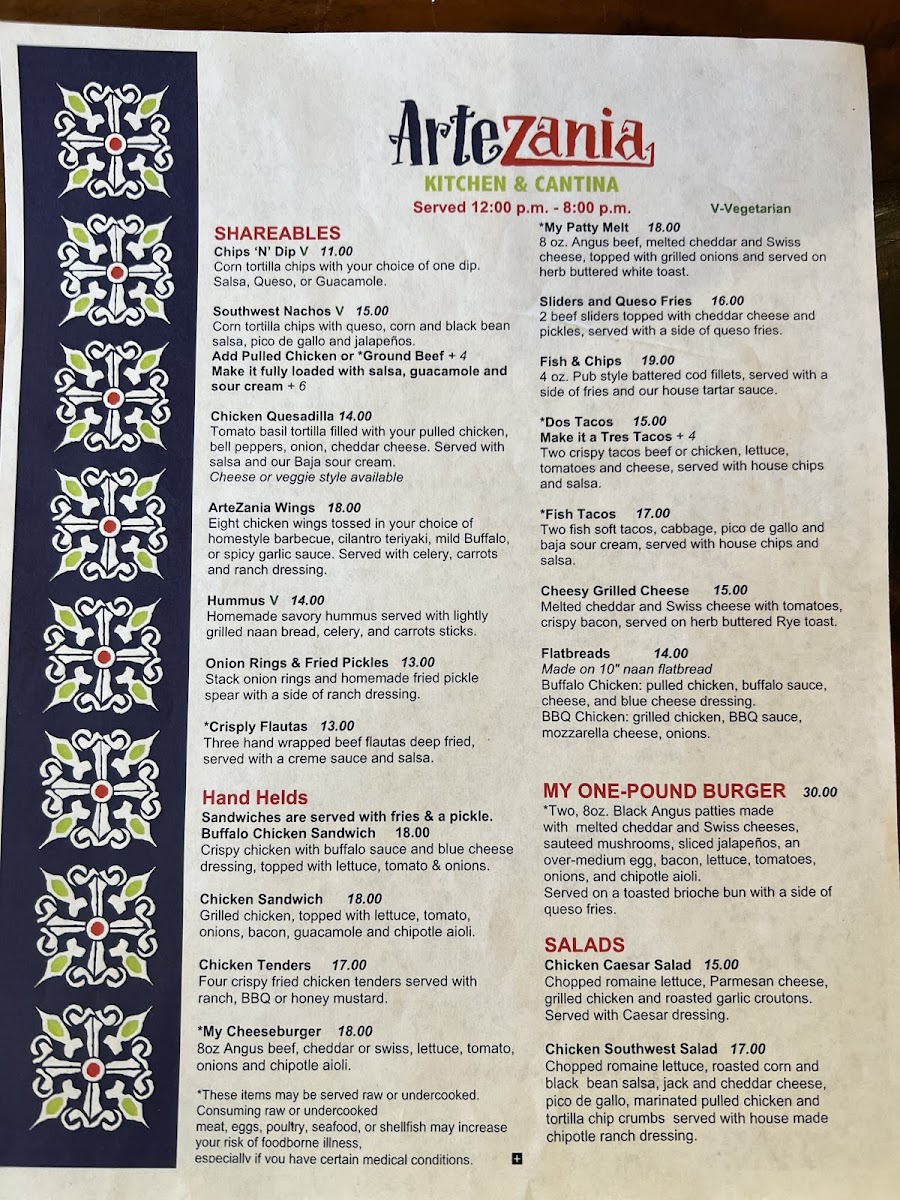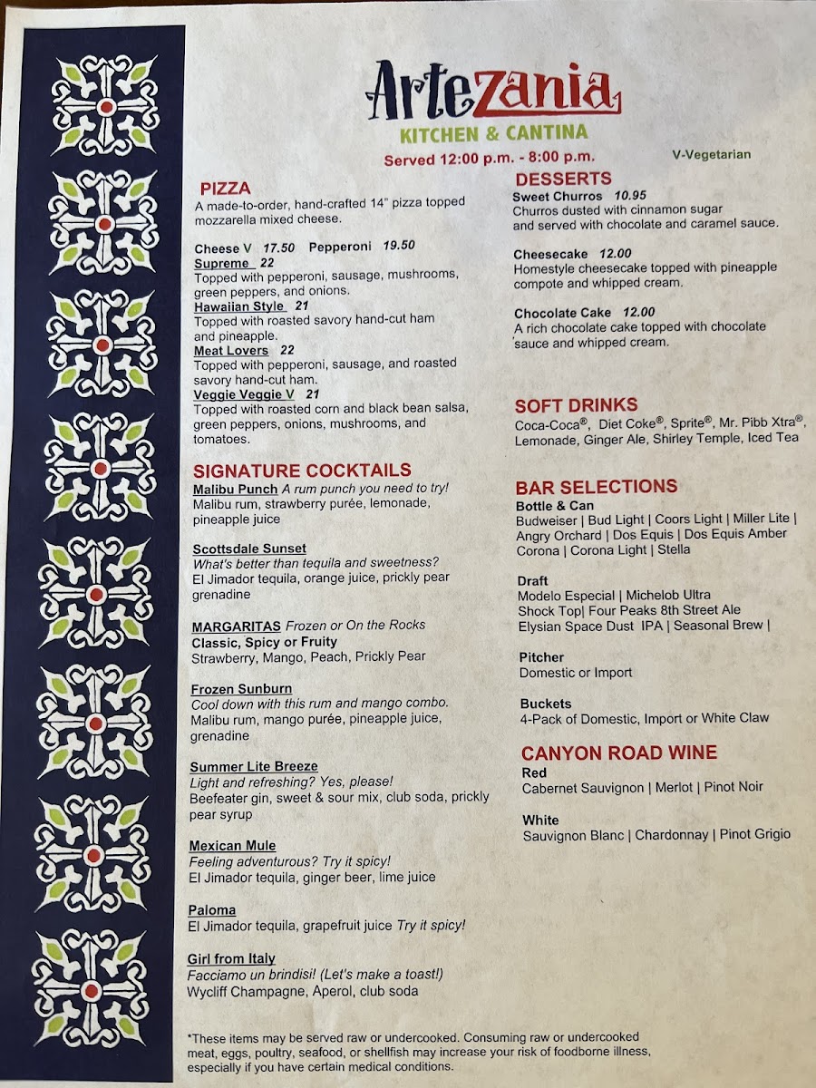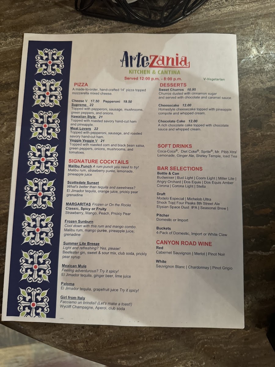 Artezania Kitchen & Cantina Menu