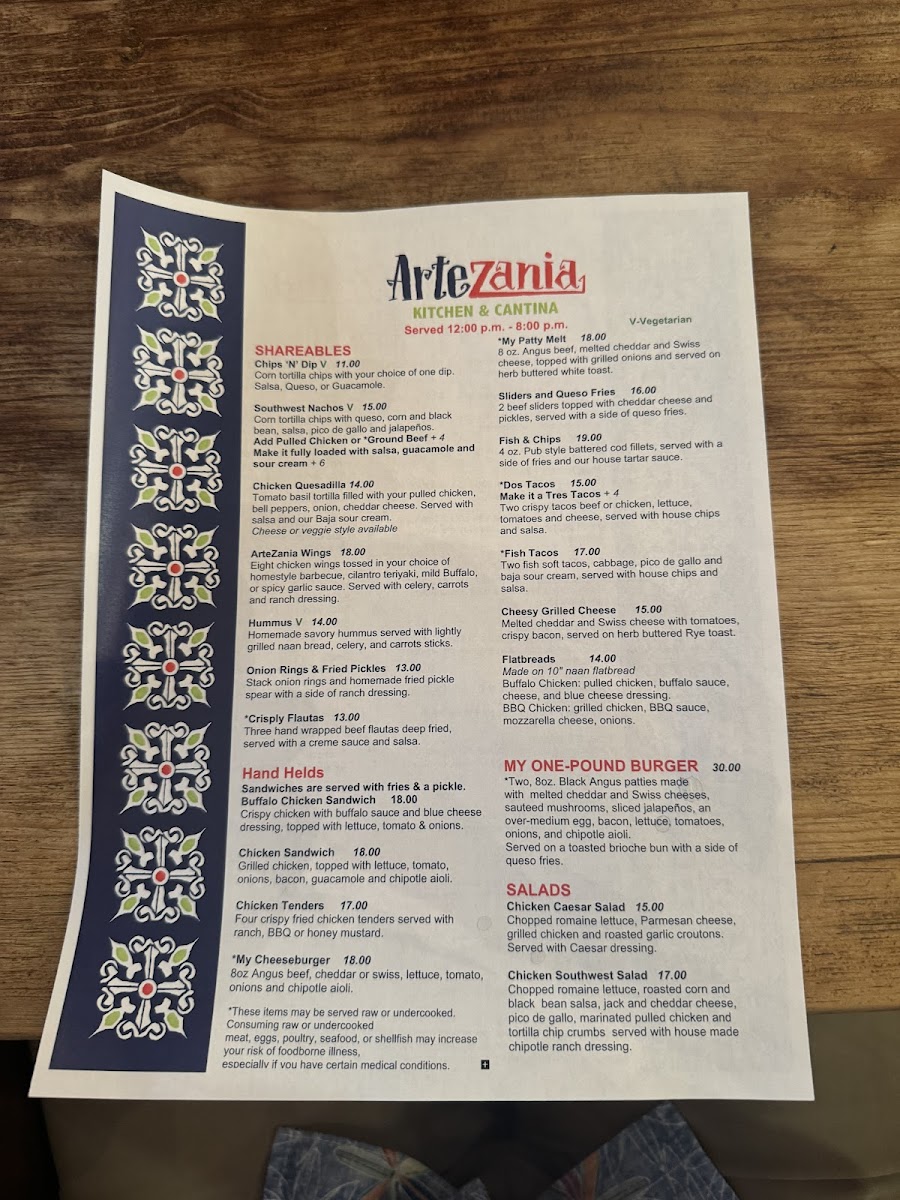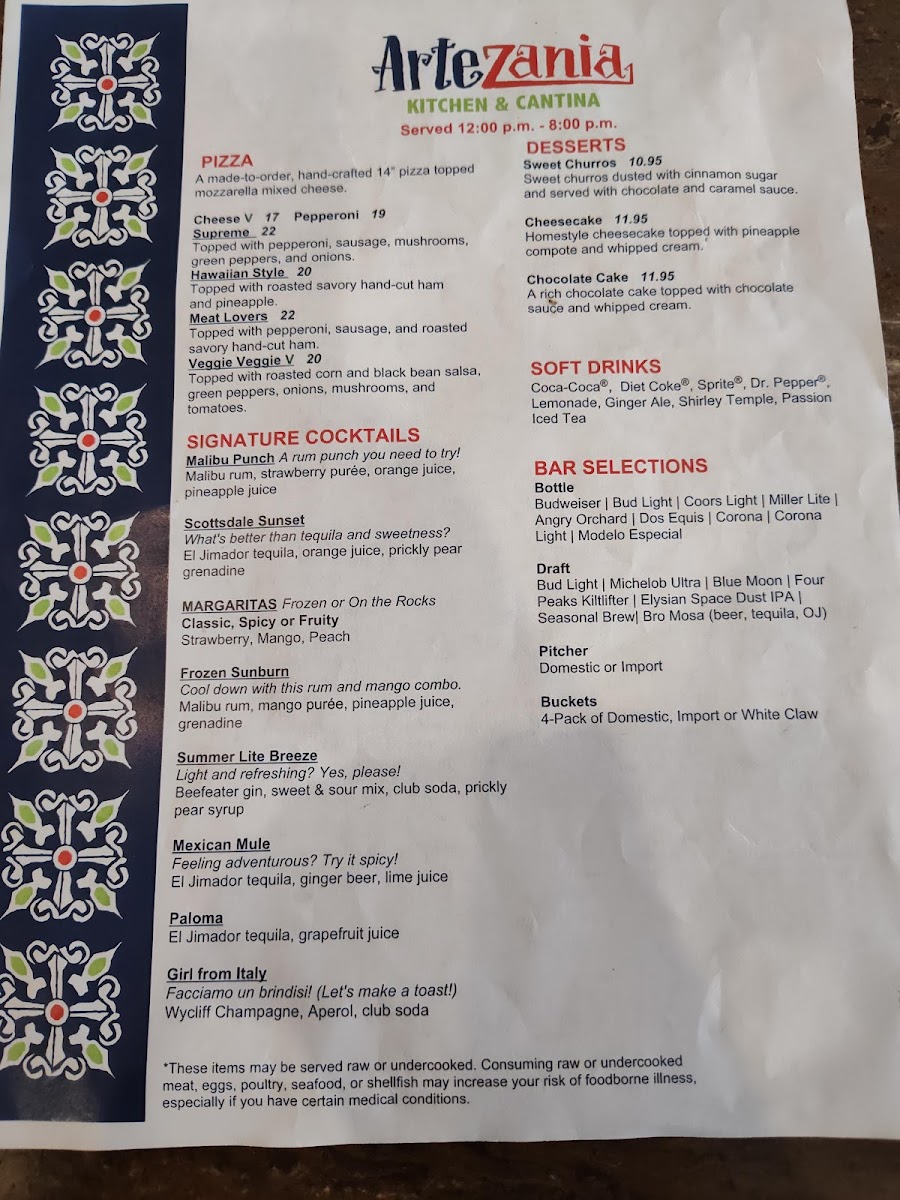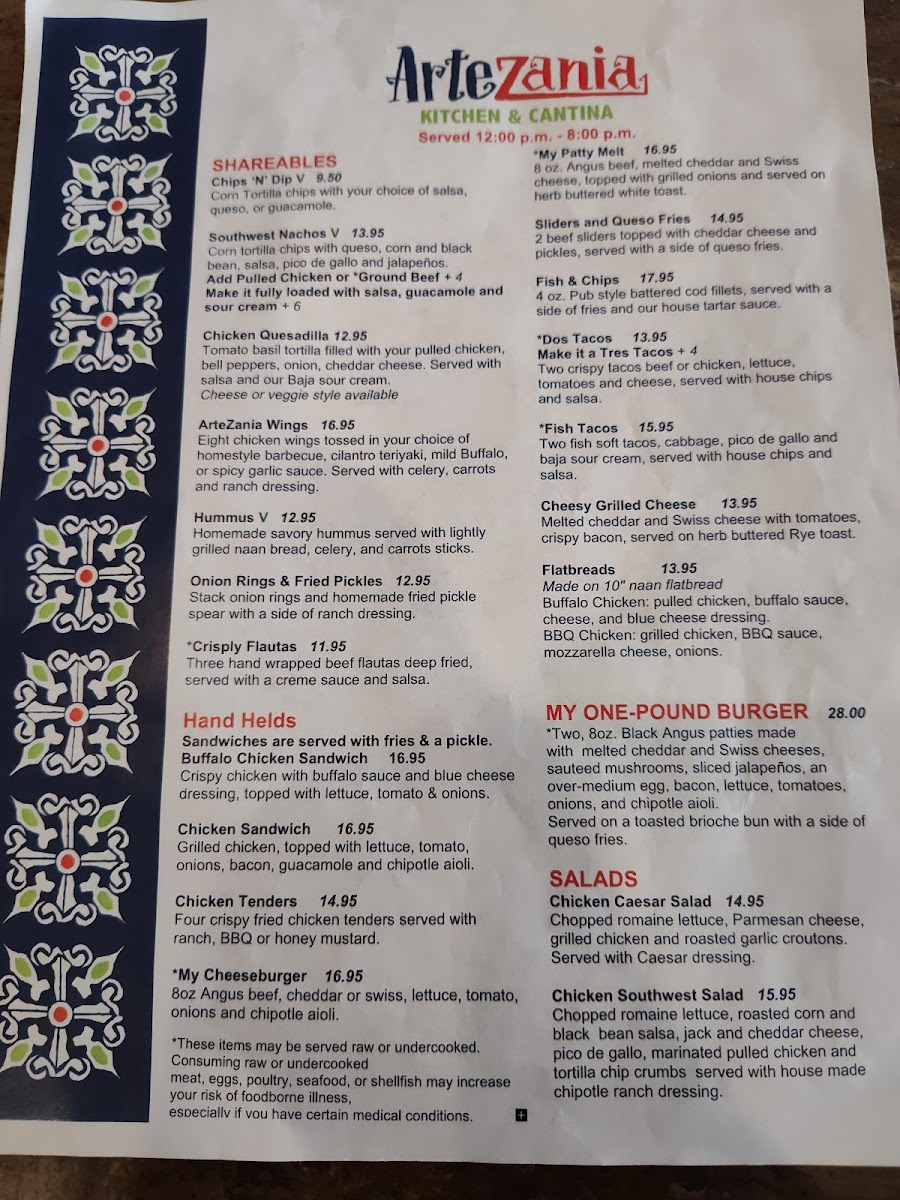 Artezania Kitchen & Cantina Menu